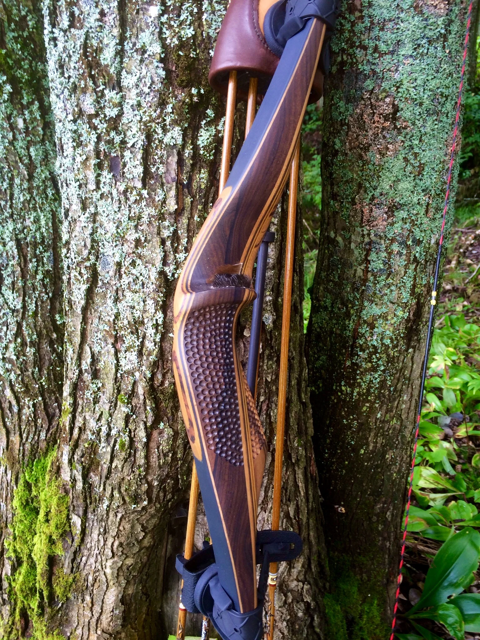 The Apparition has a long sweeping, forward handle riser, about 21" between fadeouts and relatively short, highly reflexed limbs. This combination provides very forgiving, easy shooting accuracy with excellent performance. It is absolutely dead in the hand upon release. It's available in 58", 60" or 62" length. Back and belly lams run full length through the riser for added stiffness and stability. It has a thumbrest for consistent hand placement. Shelf is cut 1/8" past center. It is available with veneers under clear glass back and belly with actionboo or foam cores. It will also be available with double carbon, back and belly. A two piece version will be available through the use of a carbon/glass sleeve, once assembled it looks identical to a one piece but is much easier to transport on those out of state hunts that require air travel.
